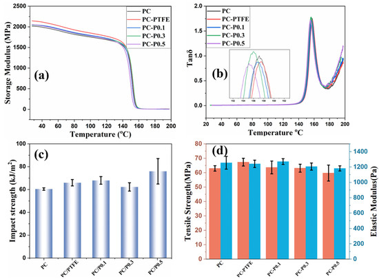 (a) Storage modulus, (b) tanδ, (c) impact strength and (d) tensile strength and elastic modulus of PC and its composites.