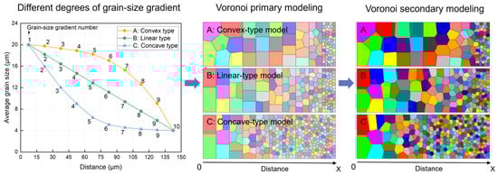 In this study, the “Voronoi primary + secondary modeling” method was used to construct a gradient polycrystalline geometry model with different gradient rates, using Neper open-source software (Version 4.9.0) [41]. Firstly, ten data points were taken on each of the three types of gradient rate curves, and ten equal intervals (15k × 50k, scale bar k = actual structure size/model size, and k is a non-zero constant) were used for comparison in the simulated region (150k × 50k). The number of grains in each interval was converted according to the gradient rate in Figure 1, and then the coordinates of the gradient polycrystalline seed centroid of ten intervals were output, which is called the Voronoi primary modeling process. Next, the centroid coordinate file was used as a new input file, and Neper’s Voronoi algorithm was used to model the whole region to obtain a two-dimensional gradient polycrystalline geometry model with a continuous gradient change in grain size, which is called the Voronoi secondary modeling process.
