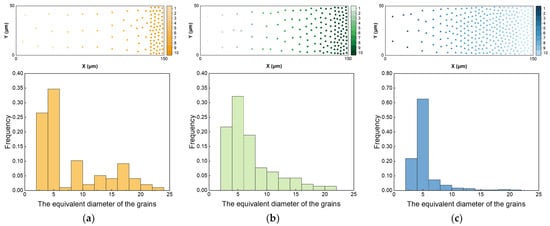 Through the above method, three types of gradient polycrystalline models corresponding to different gradient rates can be constructed, as shown in Figure 1; the two-dimensional gradient structure geometry model along the X and Y directions are 150 μm and 50 μm. The total grain numbers of the three types of gradient models are 98, 143, and 302, respectively, and the grain size varies from 20 μm to 4 μm. In addition, the meshing type is quadrilateral, the length of the grid edge is 0.5, and the total number of grids is 30,000. Figure 2 shows the distribution of gradient polycrystalline seeds (top) and the equivalent grain size (bottom) for the three types of gradient models.