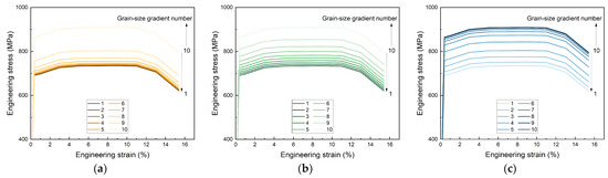 Combined with the parameters listed in Equations (1) and (2) above, the engineering tensile stress–strain curves of three types of gradient rate structures (Figure 2a–c) can be obtained.