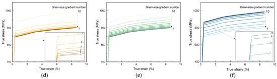 where σeng and εeng are engineering stress and engineering strain, and σtrue and εtrue are true stress and true strain. Then, engineering stress–strain curves (Figure 3a–c) and true stress–strain curves (Figure 3d–f) of materials can be obtained, and each sub-figure contains ten separate curves, some of which are very close to each other. The global stress–strain values (Tables S1 and S2 in the Supplementary Materials) have been obtained by calculating the yield strength and tensile strength of different grains based on the Hall–Petch equation, thus assigning different material parameters to different gradient grains according to grain size.