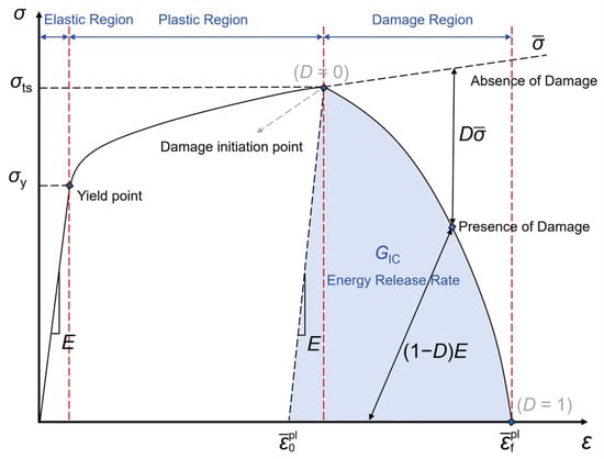 In order to describe the material degradation during plastic deformation, a damage model was employed in this study. For the sake of generality, this study chose the ductile damage evolution model embedded in Abaqus software (Version 2020) as the damage constitutive model of the material. The damage evolution of elastoplastic materials includes the reduction in the flow stress and the degradation of elasticity, and the characteristic stress–strain behavior of the ductile metal subjected to damage is shown in Figure 4, where the solid black line represents the damaged stress–strain curve and the dashed line above the solid line represents the curve without damage. In Figure 4, E is the elastic modulus of the material, σy is the yield strength of the material, σts is the tensile strength of the material and the stress of the material when it is damaged, is the equivalent plastic strain at the time of damage, and is the equivalent plastic strain at failure, i.e., when the overall damage variable reaches D = 1 [44]. The damage constitutive model specifies at least four ductile damage parameters, including stress triaxiality, fracture strain, strain rate, and fracture energy. In this study, the triaxiality of stress was taken as 0.33, the strain rate was taken as 0.00, and the formula for calculating the fracture energy was as follows [44]: