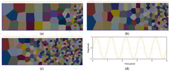 The gradient models shown in Figure 1 were imported into the commercial finite element package Abaqus (Version 2020) in a pre-processing step. To simulate the conditions of uniaxial fatigue, suited boundary conditions were applied, where the nodes at the bottom and the left side have been fixed and the load is applied to the nodes on the top surface of the model, as shown in Figure 5a–c. The initial load amplitude was set to 500.00 MPa, which was converted into a displacement-controlled loading amplitude of 0.12 μm, resulting in a tension–compression amplitude ratio of R = −1; Figure 5d shows a schematic diagram of the load amplitude. The nodes on the right-hand side, where the smallest grains are situated, are free of boundary conditions, mimicking the free surface of the material. Since the initial crack in the actual microstructure usually originates in this fine-grained region of the surface of the material, an initial microcrack is prefabricated at the center of the right end of the model to study the crack propagation behavior in the different microstructures. The size of prefabricated microcracks is 2 μm × 1 μm. By comparing the fatigue crack propagation behavior in different gradient rate models, the optimal strategy to design a gradient rate for maximum fatigue performance of gradient materials was derived.