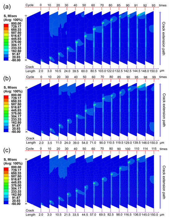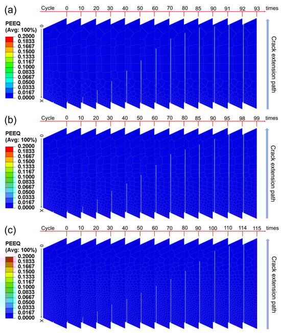 By performing finite element simulations under cyclic loading on the gradient structure of high-strength steel models corresponding to three types of gradient rates, the Mises stress values and equivalent plastic strain values under different loading cycles and the crack propagation length were obtained. Figure 6 and Figure 7 show the Mises stress and equivalent plastic strain (PEEQ) result contours for different gradient models, respectively, and the cycle numbers of different stages and their crack propagation lengths are marked in the diagrams to visually demonstrate the crack propagation process. The Mises stress varies from −50 MPa to 800 MPa in the contours with a more obvious change, and the equivalent plastic strain in the contours varies from 0 to 0.2 with a less obvious change.