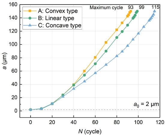 In order to further reveal the quantitative relationship between crack propagation and the number of cycles, a graph of the variation in crack propagation length with the number of cycles was drawn based on the simulated data, as shown in Figure 8.