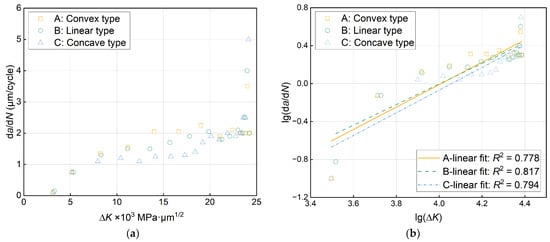 Fatigue data scatter and fitting results: (a) data scatter of fatigue crack propagation rate, da/dN, and stress intensity factor amplitude, ∆K; (b) data scatter and linear fitting results of double logarithmic lg(da/dN) and lg(∆K).