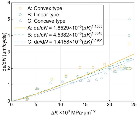 Taking the common logarithm on both sides of Equation (6), the relationship between the fatigue crack propagation rate, da/dN, and the amplitude of the stress intensity factor, ∆K, can be obtained as follows:
