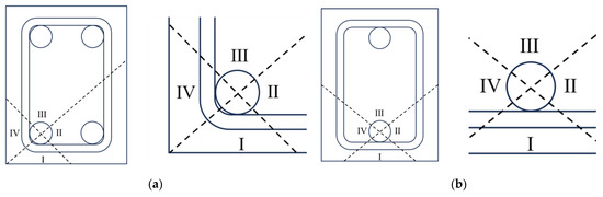 As shown in Figure 1a,b, the longitudinal steel bar can be classified into two types according to the position of the steel bar in the stirrup cage: the steel bar at the corner of the stirrup cage and the steel bar at the middle of the stirrup cage. Based on the symmetry, the constraint of stirrups and concrete around the steel bar at the corner of the stirrup cage can be divided into four parts: Parts I, II, III, and IV, as shown in Figure 1a. The steel bar in Parts II and III is simplified as a cylinder in semi-infinite space according to elastic mechanics, while the steel bar in Parts I and IV can be seen as a cylinder in finite space. The constraint of stirrups and concrete in Parts I and IV on the steel bar is obviously milder than that in Parts II and III. So the corrosion cracking of the steel bar at the corner of the stirrup cage usually appears in Parts I and IV. A similar analysis can be carried out on the longitudinal steel bar in the middle of the stirrup cage. In this situation, Parts II, III, and IV will apply a stronger contraint to the steel bar than in Part I. As a result, the steel bar in the middle of the stirrup cage in Part I is more susceptible to cracking. For simplicity, the easy-to-crack part of the concrete and stirrup around a longitudinal steel bar can be multiplied and folded to replace the other parts to model the critical corrosion cracking of reinforced concrete, which can be seen in Figure 1c. From the inside to the outside, the simplified model is composed of a steel bar, stirrups, and concrete. It should be noticed that there is a small amount of concrete between the longitudinal steel bar and the stirrup. Therefore, the regional replacement can be further simplified to establish a three-layered hollow cylinder model to characterize the critical cracking induced by the corrosion of the longitudinal steel bar, as shown in Figure 1d. At the center of the three-layered cylinder model, the original longitudinal steel bar is represented as a circular void. The stirrup is equivalent to a thin layer evenly distributed longitudinally around the void. The volume of the stirrup layer is the same as that of the spaced stirrups, and the center line of the cylinder coincides with the centroid of the stirrup. The inner concrete layer is defined as the concrete between the stirrup layer and the longitudinal steel bar, and the outer concrete layer is equivalent to the concrete cover. Based on the three-layered model, the uniform corrosion-induced expansion state is simplified to the plane strain state. The radial displacement caused by the corrosion-induced expansion force can still be solved by elastic mechanics. In this research, the corrosion of stirrups is ignored for simplicity, and the corrosion of the longitudinal steel bar is assumed to be uniform.