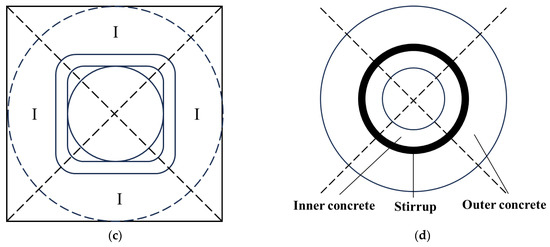 The simplified model demonstrating the critical cracking induced by the corrosion of the steel bar. (a) Division of concrete around the steel bar at the corner of the stirrup cage; (b) Division of concrete around the steel bar in the middle of the stirrup cage; (c) The result of regional replacement; (d) Three-layered hollow cylinder model.