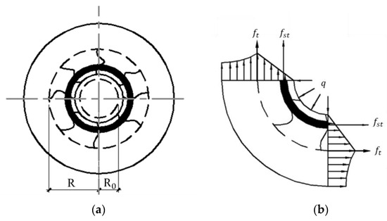 Here, the cracking force F is defined as the sum of Fcc, Fcu, and Fst. The radius R from the crack tip to the cylinder center at the moment of cracking is calculated by using ∂F/∂R = 0. The radial displacement ur,1(R0) on the inner face of the inner concrete layer can be obtained by Equation (11).