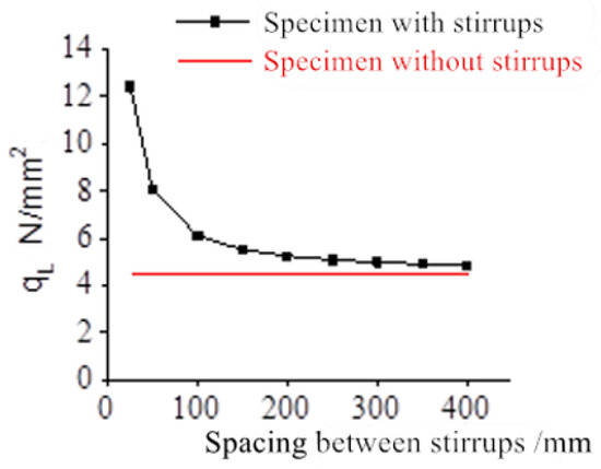 It can be seen from the figures that both qL and ρL decrease as the spacing between the stirrups increases. When the spacing between the stirrups is more than 100 mm, both qL and ρL remain almost unchanged. When the spacing between the stirrups is less than 100 mm, both qL and ρL increase sharply as the spacing between the stirrups decreases.