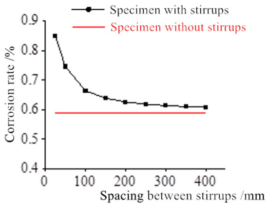 Critical corrosion rate of the ribbed steel bar at the cracking time with different spacings between the stirrups.