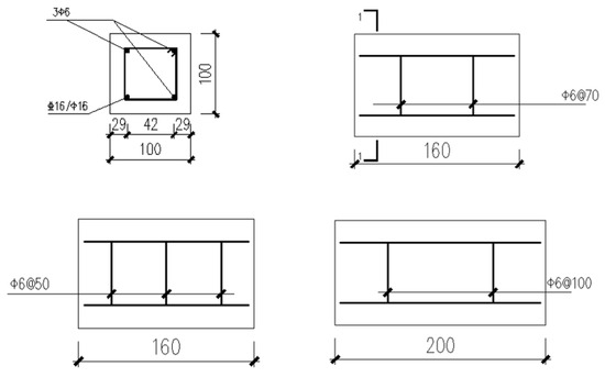 A total of 24 specimens were designed for this experiment, as shown in Table 2. Figure 7 depicts the geometric dimensions of the specimens and how the rebars are placed. Some of the longitudinal bars are ribbed steel bars of HRB400 with a diameter of 16 mm, and the others are plain round bars of type HPB300 with a diameter of 16 mm. The stirrups are plain round bars of type HPB300 with a diameter of 6 mm. The thickness of the concrete cover is 15 mm.