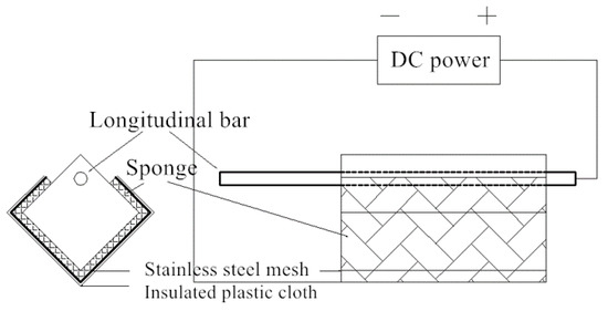 In order to simulate the corrosion of the steel bar, a method of accelerating galvanic corrosion was used. The galvanic accelerated corrosion method is shown in Figure 8. The concrete block is covered with a sponge, and the sponge is secured with stainless-steel mesh. A layer of insulating plastic cloth covers the outside of the stainless-steel mesh to ensure that the concrete remains wet during the test. The positive pole of the DC power supply is connected to the exposed steel bar, and the negative pole is connected to the stainless-steel mesh. The reason for this connection is that electrons flow from the negative to the positive side of DC power. As the anode, the steel bar loses electrons, so the electrons enter the stainless-steel mesh and flow out from the exposed section of the steel.