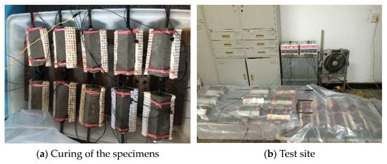 The concrete block needs to be immersed in a 5% NaCl solution for three days before electrification to make the concrete fully wet. At the same time, in order to prevent water runoff and electricity leakage, the surface of the stainless-steel mesh needs to be sealed with a waterproof and insulating plastic cloth, and a 5% NaCl solution needs to be added every day to ensure its moisture. The curing of the specimens and the test site are shown in Figure 9.