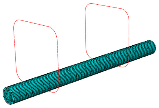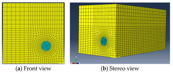 The length and width of the cross-section of the model are 100 mm. A 16 mm diameter HRB400 longitudinal bar is placed near the corner of the model. The thickness of the concrete cover is 15 mm. The spacing between stirrups is divided into four conditions: 100 mm, 70 mm, 50 mm, and 0 (without stirrup). The number of steel bars is shown in Table 9. The constitutive relation of the concrete is based on the plastic damage model of C55 concrete given in Code for design of concrete structures GB50010-2010 [38]. A damage field is used to describe the track of the internal cracks in the concrete. The model adopts the stirrup of HPB300, whose elastic modulus is 2.1 × 105 N/mm2, Poisson’s ratio μ is 0.3, and yield strength is 300 N/mm2. The type of finite element in this model is C3D8R. C3D8R is an eight-node linear hexahedral element, which is the least time-consuming hexahedral element in ABAQUS, so it is the most widely used in the practical application of a volume element [39]. The model contains 26500 elements, in which the element density is increased at the steel–concrete interface to improve the calculation accuracy. The size and mesh generation of the model are shown in Figure 11, and the position relationship between the longitudinal bar and stirrups is shown in Figure 12.