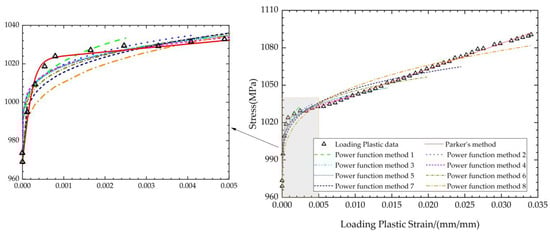 For the stress–strain relationship in the unloading plastic region, the two methods listed above were used to fit the eight groups of data, which started at the unloading yield point. The adjusted R2 was used as the evaluation standard to compare the accuracy of the fitting results of the two functions. The data on the horizontal axis are the unloading plastic strain, and the data on the vertical axis are the corresponding absolute values of true stress, as the Mises yield model was adopted in this paper. The fitting situations of the eight groups of unloading plastic data are shown in Figure 8, and the adjusted R2 of the different fitting methods is shown in Table 4. It can be seen from the results that, when is small, there is not much difference in the fitting of Parker’s method and the power function method; when is larger, the power function method shows better correlation. The average value of adjusted R2 also indicates that the power function method has a better fitting performance.