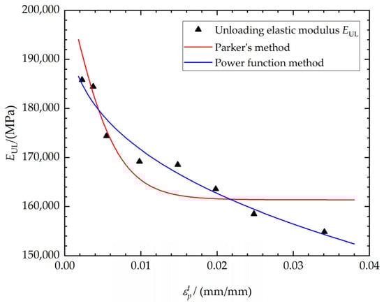 The unloading elastic modulus EUL is a function of the loading elastic modulus EL. Figure 6 shows the fitting comparison of the unloading elastic modulus EUL and . As shown in Figure 6, the fitting of the power function method is more closely aligned with the experimental results, whereas Parker’s fitting method is less effective in capturing the relationship at higher tensile plastic strain.