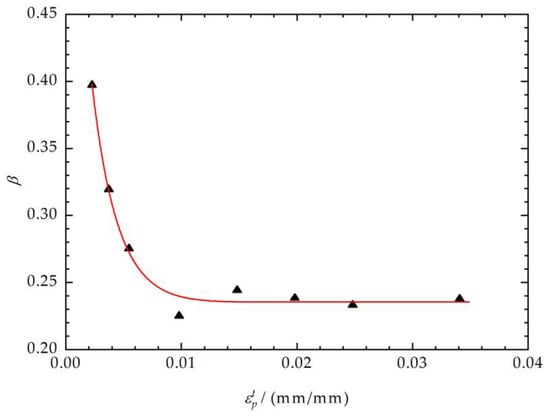The function fitting relationship between the Bauschinger coefficient factor β and loading yield stress is shown in Figure 7. The unloading yield point, as the endpoint of the unloading elastic region, is described in the equation by β and . The Bauschinger coefficient factor β remains essentially unaltered when is greater than 0.02.