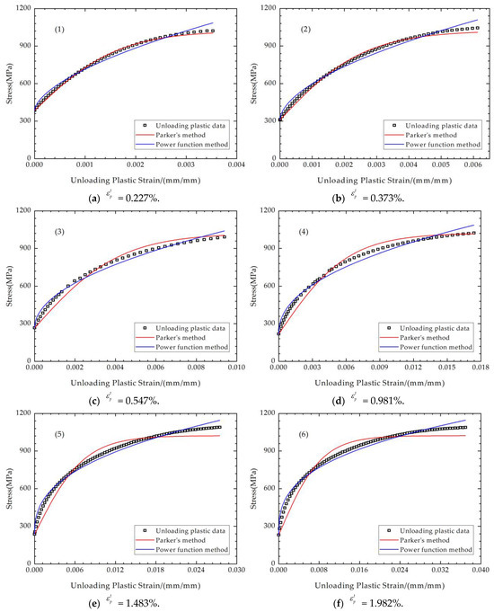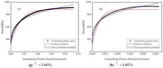 Figure 5 shows the fitting of the loading plastic curves with different methods. As shown in Figure 5, Parker A.P.’s fitting method fits the loading elastic region very well. eight groups of stress–strain data with different maximum plastic strain are fitted with the power function method, and it is clear that the use of power functions cannot achieve the same level of accuracy as Parker A.P.’s fitting method in any of the cases. In fact, the shape of the power function is not suitable for fitting stress–strain data like these. Consequently, for the tensile plastic section, it is recommended to employ Parker A.P.’s method to describe its mechanical behavior.