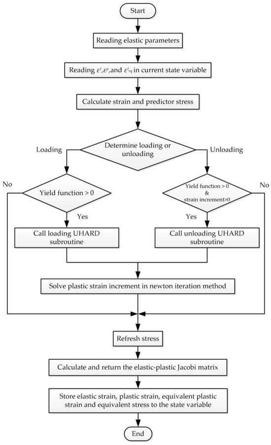 The logic of the finite element calculation is shown in Figure 9. The direction factor loaddir is employed to indicate whether the element is loading or unloading. The judgment logic is as described in Equation (13):