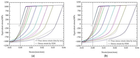 The results obtained from Parker’s fitting equation, as well as those from this study, are depicted in Figure 10. It can be observed that both methods effectively describe the Bauschinger effect and demonstrate the influence of tensile plastic strain on the compressive stress–strain curve. Nevertheless, it is well known that the reverse yield percentage is not too large for the autofrettage unloading process, so the fitting of the region near the unloading plastic point should be focused on. It is evident that the present study’s fitting equation exhibits a more precise agreement with the experimental data in these areas. For the loading regions (a) and (b), the stress–strain relationship calculated by FEM is in good agreement with the experimental data. This is because the equations used are consistent and suitable. However, for the unloading regions (c) and (d), the difference in the accuracy of different fitting equations comes from the difference in fitting degrees. The errors come from the fitting of the unloading elastic modulus. The fitting degree of EUL by Parker’s method is not very satisfactory, which will to some extent affect the strain magnitude of the compressive plastic point, which is the starting point of the unloading plastic section (d). The lower fitting degree of the unloading plastic section further amplifies the disadvantage of Parker’s method in terms of accuracy, which will further deviate from the stress–strain relationship determined by the experiment. At the same time, the error of the stress–strain curve of the unloading plastic zone obtained by the two methods is also consistent with the fitting error in Figure 8a–h.