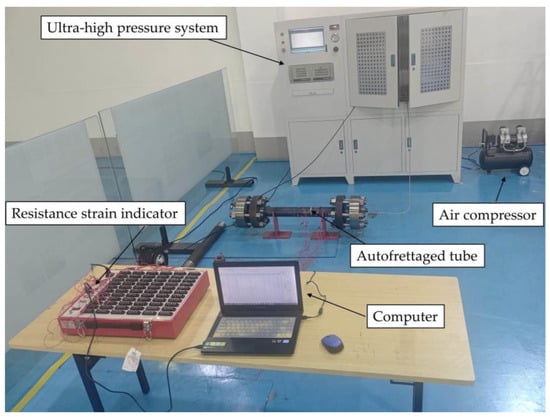 Experiments were conducted to investigate the hydraulic autofrettage of thick-walled straight tubes. Due to space constraints, only a brief description of the experimental process will be provided here. The experiment was conducted on two thick-walled cylinders, both with an outer diameter of 88 mm, an inner diameter of 40 mm, and a length of 900 mm (including threads at both ends). Both ends of the thick-walled tubes were sealed with flanged compression spherical lens gaskets. The autofrettage pressures were 680 MPa and 780 MPa, respectively, which were higher than the optimal autofrettage pressure of 631 MPa determined from the ideal elastoplastic model based on Mises stress according to theoretical calculations [40]. This pressure was considered to be less effective than expected for autofrettage in practice, due to the fact that the material’s tensile nonlinearities were not taken into account. After the autofrettage treatment, one end of the tube was cut off at a length of 25 cm, which was then used to detect the residual stresses in the radial and hoop directions by the Sachs method—a destructive residual stress detection method that is widely used in the detection of residual stresses of autofrettaged thick-walled tubes [41,42,43]. The sampling density was initially greater at the plastic zone than the elastic zone. A photograph of the working state of the experimental system is shown in Figure 11.