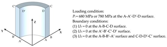 The finite element calculation utilized a three-dimensional solid model with dimensions equivalent to those of the thick-walled straight tubes employed in the experiment. Each tube can be regarded as a thick-walled straight tube with two open ends, allowing for an analysis of its mechanical properties. The modeling requires only one-quarter of the thick-walled straight tube and half of the actual tube length. ABAQUS/CAE Standard implicit calculation was adopted for the FEM calculations, and C3D8 was chosen as the element type, with a total number of 10,560. There were 22 elements in the thickness direction of the tube with an eccentricity of six, and 12 elements in the hoop direction of the quarter-circle, with 40 elements in the lengthwise direction. For the constraint and load settings, pressure was loaded on the inner surface of the tube, and normal constraints were applied to all symmetric surfaces. Subsequently, the internal pressure was first applied to the autofrettage pressure of 680 MPa or 780 MPa on the inner surface, and then unloaded to 0. The constraint and load conditions of the model are shown in Figure 12.