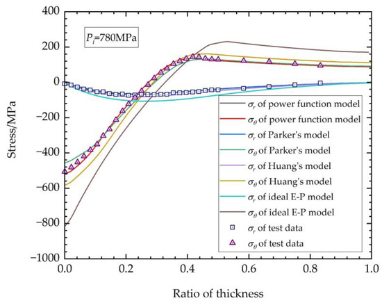 As can be seen from the table, the ideal E-P model has the worst precision, as it overestimates the stress at the inner surface by over 40%. The result of Huang’s model is much better than that of the ideal E-P model, with error over ~10%, but it is still higher than that of the kinematic hardening models. It can clearly be seen that the accuracy of the power function model used in this study is much greater than that of any other models, possessing the highest accuracy, with error of less than 3%, decreasing the error by at least 50% than other models.