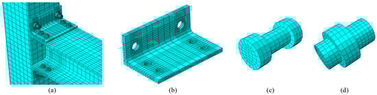 Meshed elements (a) full specimen, (b) angle, (c) ordinary bolt, and (d) welded bolt.