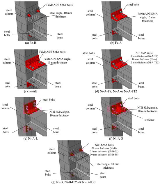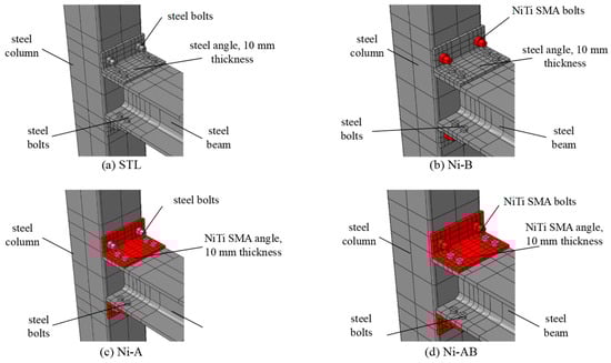 Following the validation of the FE model with the experimental results of the I-beam-hollow column steel connection [33] in the first phase of this study, the second phase aimed at investigating the cyclic behavior of the connection when the steel angles and bolts are replaced with SMA angles and bolts. Therefore, four innovative approaches were used for studying the effect of the SMA on the cyclic behavior of the connections compared to conventional steel connections: (a) steel bolts and steel angles (b) SMA bolts and steel angles, (c) steel bolts and SMA angles, (d) SMA bolts and SMA angles. The specimens were labeled as X-Y where X represents the alloys (Ni for NiTi) and Y represents the elements replaced with SMA (A, B, and C denote angles, bolts, and both bolts and angles, respectively). The test matrix and schematic drawings of the investigated specimens in the numerical study are presented in Table 4 and Figure 9, respectively.