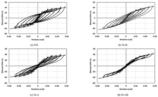 Hysteretic moment-rotation response of the specimens: (a) STL (b) Ni-B (c) Ni-A (d) Ni-AB.