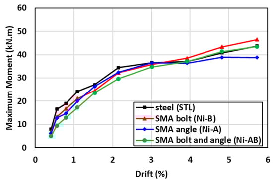 The maximum moment capacity of all specimens versus the corresponding drift ratio is presented in Figure 11. The results showed that the use of SMA in the forms of bolts (Ni-A), angles (Ni-B), or a combination of both angles and bolts (Ni-AB), has an insignificant influence on the moment capacity of the beam-column connections compared to the conventional steel connection (STL). It can be observed that the specimens equipped with SMA elements showed slightly lower values compared to steel specimens up to a drift of 3%. However, at higher drift values, the Ni-A resulted in 6.1% higher value compared to the STL and Ni-AB. On the other hand, using the SMA angle reduced the maximum moment by 5.5% compared to the control specimen. In addition, while the Ni-A and Ni-AB enhanced the moment capacity of the beam-column connection, the moment capacity of the Ni-B was slightly lower than that of the STL. This reduction was attributed to the difference in the stiffness between the steel bolts and SMA angles, which caused some redistribution of stresses at higher loads leading to formation of plastic strain in the bolts and ultimately resulting in a tensile failure in the welded bolts.