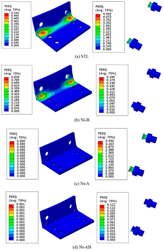 The failure mode presented in Figure 12 clearly shows that the STL experienced plastic strains in both the bolts and angles of the beam-column connection and the plastic strain recorded in the bolts were very high, 5 times higher than the plastic strain of the angles. This observation was also noticed in the numerical FE models. The numerical results of the FE models were consistent with the experimental failure mode (tensile failure mode in the bolts), as shown in Figure 8. Although the failure mode of the other specimens (Ni-B, Ni-A, and Ni-AB) was also dominated by tensile failure of the bolts, they have exhibited different plastic strain distributions across the bolts and angles. The plastic strains of the Ni-B were severely concentrated in the steel angles at the junction where the two plates form the angle while the SMA bolts experienced slightly lesser plastic strain, roughly 25% of the plastic strains observed in the angles. However, the Ni-A showed quite a different mechanism. The SMA angles had no plastic strain whereas the steel bolts were found to record high plastic strain values. When the steel bolts and angles were replaced by SMA (Ni-AB), the plastic strains were substantially reduced compared to the STL. The SMA angles experienced roughly no plastic strain, while the plastic strain in the bolts was insignificant. The formation of plastic strains does not imply failure in the case of the SMA material. Instead, it implies that the deformations experienced by the angles or the bolts are irrecoverable. The bolts and angles begin to fail when the ultimate stresses exceed the ultimate strength. This explains the tensile failure in the bolts of the Ni-AB, while having very little plastic strains compared to the other cases.