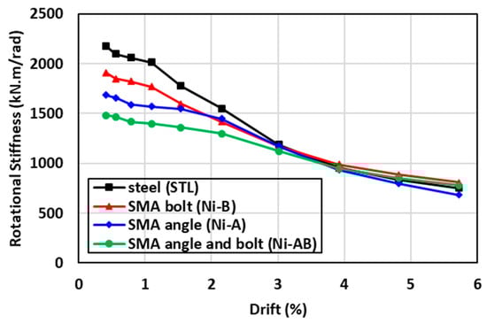 The recorded moments and their corresponding drifts at the end of each half cycle were used to calculate the rotational secant stiffness of each specimen [55]. The rotational secant stiffness in each cycle was calculated using a line drawn between the maximum positive drift point in one half of the cycle and the maximum negative drift point in the other half of the cycle. This secant stiffness is intended to provide a qualitative measure of the stiffness degradation of the specimens. The comparison of the rotational stiffness degradation is plotted versus the corresponding drift ratio in Figure 13 for each specimen tested. It can be observed that while the STL had the highest initial rotational stiffness compared to the other specimens, its rotational degradation rate was substantial such that beyond 3% drift the Ni-A, Ni-B, and Ni-AB performed as good as the STL. The results showed that the Ni-B and Ni-A resulted in a lowered initial rotational stiffness by 12% and 23%, respectively. In addition, a further reduction in the initial rotation stiffness by 32% was also noticed in the Ni-AB. The rate of rotational stiffness degradation was the lowest in the Ni-AB, followed by Ni-A and Ni-B. Moreover, the rotational stiffness of the beam-column connections seems to be similar beyond 3% drift, irrespective of the material used in the bolts and/or the angles.