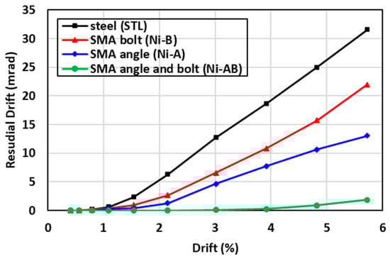Residual drift is defined as the permanent drift of a structure caused by the inelastic deformations due to earthquake excitations [56]. The permanent deformations of structures are a key design criterion that determines the serviceability of the structures and the post-earthquake maintenance cost. Figure 14 presents a comparison between the residual drift values of the beam-column connection. The results indicated that the STL had the highest residual drift whereas the residual drift of the (Ni-AB) specimen was substantially reduced to values close to zero. The use of the SMA in the bolts (Ni-B), in comparison to the STL, resulted in a significant reduction in the residual drift by 30%. Moreover, a further decrease in the in the residual drift of 59% was recorded for the Ni-A, denoting the greater effectiveness of utilizing the SMA angles in controlling the residual drift than the SMA bolts. Interestingly, the use of SMA bolts and angles tremendously minimized the residual drift by almost 94% compared to the STL. The permanent deformations, resulting in the STL (steel beam-column connection), were due to the formation of plastic strains in the vicinity of the steel angles and bolts. Nevertheless, replacing the steel with the SMA decreased these inelastic strains drastically, as shown in Figure 14. The self-centering factors of the specimens investigated were also determined and summarized in Table 1 following Equation (1) as defined by Shajil et al. [57]. The self-centering of the Ni-A and Ni-B were increased to 0.62 and 0.77, respectively compared to 0.45 for STL, as presented in Table 5. These values were drastically increased to 0.97 for Ni-AB.