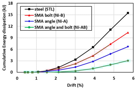 The energy dissipation was calculated for each specimen as the area enclosed by the load-displacement envelopes for each cycle [58]. The cumulative energy dissipation was calculated by summing the values in consecutive cycles up to the end of the testing. The cumulative energy dissipation versus the corresponding drift ratio is presented in Figure 15. The results showed that the STL specimens had the highest cumulative energy dissipation, whereas replacing the steel angles and bolts with SMA (Ni-AB) significantly resulted in the lowest reduction in the cumulative energy dissipation. The reduction in energy dissipation for the SMA connection, compared to the steel connection, could be attributed to differences in the cyclic behavior between the SMA and steel. Nevertheless, the energy dissipation is considered an essential factor in determining the behavior of structure in the post elastic response of the system; the SMA has the distinct advantage of undergoing high strain cycles without causing plastic deformations (4.0–6.0% plastic strain for SMA vs. 0.21% for steel) as shown in Figure 16. The use of SMA bolts (Ni-B) caused a reduction in the energy dissipation by 33% compared to the STL. Additionally, a further reduction in the energy dissipation of about 57% and 80% was also observed when the SMA angles (Ni-A) and both SMA angles and bolts (Ni-AB), respectively, were used.