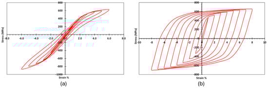Stress–strain curve of cyclic tension–compression tests: (a) Nitinol SMA; (b) steel. Reprinted from [59], with permission from American Society of Civil Engineers.