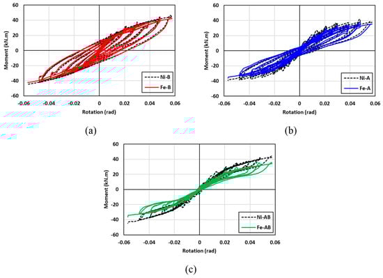 Effect of SMA type on the hysteresis response (a) Ni-B vs. Fe-B (b) Ni-A vs. Fe-A (c) Ni-AB vs. Fe-AB.