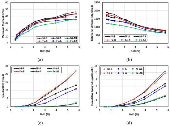 The hysteresis moment-rotation response of the connections fabricated with NiTi and FeMnAlNi SMA are shown in Figure 18. The effect of the SMA material types were investigated for three cases: (a) the angles were only made of SMA (Ni-A vs. Fe-A); (b) the bolts were only made of SMA (Ni-B vs. Fe-B); (c) both angles and bolts were made of SMA (Ni-AB vs. Fe-AB). In general, the hysteresis moment-rotation response seemed to be comparable between the two SMA materials, with a slight increase in the moment capacity for the specimens made of NiTi. The variations between the two hysteresis moment-rotation responses were more noticeable when both angles and bolts were made with SMA materials (Ni-AB vs. Fe-AB), whereas very little to no variations were observed in the hysteresis response when steel was replaced with SMA for the bolts (Ni-B vs. Fe-B). Figure 19 shows the influence of the SMA type on the performance of the connection in terms of the maximum moment, rotational stiffness, residual drift, and energy dissipation. The results indicated that the specimens made with FeMnAlNi SMA exhibited a lowered moment capacity by up to 18% compared to control steel connection and up to 19% compared to specimens with NiTi SMA. This was due to relatively inferior mechanical properties FeMnAlNi SMA compared to the corresponding properties of NiTi SMA and steel. Furthermore, the rotational stiffness of the NiTi specimens showed superior performance than that of the FeMnAlNi specimens at drifts less than 3% and the initial rotational stiffness of the Ni-B, Ni-A and Ni-AB specimens were enhanced by 6%, 13%, and 17% compared to the Fe-B, Fe-A, and Fe-AB specimens, respectively. However, the stiffness degradation rate of the FeMnAlNi and NiTi specimens was very comparable and the deviations between the two materials appeared to diminish beyond 3% drifts. As for the residual drift (self-centering capability), both materials exhibited similar behavior with the exception of the connections utilizing Fe-A and Ni-A mainly in the angles. The variations in residual drift between the Fe-A and Ni-A specimens ranged from 0% to 7%. It is worth mentioning that the use of SMA in both angles and bolts significantly reduced the residual drift to values less than 2% even at higher cycles. The cumulative energy dissipation showed a great similarity of the behavior between the two SMA materials. The highest cumulative energy dissipation was observed for the connections utilizing SMA in bolts only, whereas the use of SMA in both angles and bolts resulted in the lowest cumulative energy dissipation. The difference in cumulative energy dissipation between the FeMnAlNi and NiTi varied between 1.5% and 4.4%. It can be concluded that Fe-based SMA could be a good alternative of NiTi in self-centering applications.