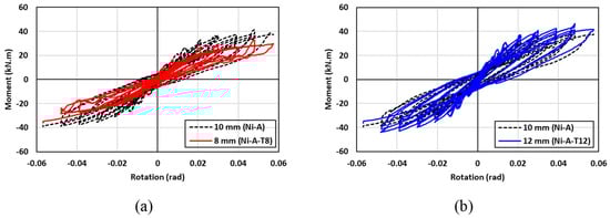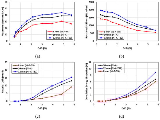 The hysteresis moment-rotation response of the connections with three various SMA plate thicknesses is shown in Figure 20. To investigate the effect of the SMA plate thickness on behavior of the beam-column connection, three plate thicknesses of 8 mm, 10 mm, and 12 mm were considered. In general, the hysteresis moment-rotation response seemed to be enhanced as the plate thickness was increased as shown in Figure 20. Figure 21 shows the results of the moment capacity, rotational stiffness, residual drift, and cumulative energy dissipation for the three plate thicknesses. It is observed that increasing the thickness of SMA angle from 8 mm to 12 mm was found to be effective in enhancing the moment capacity and initial rotational stiffness of the connection by up to 40% and 38%, respectively. It should be highlighted that the enhancement in the moment capacity due to the increase in the thickness was more pronounced than the enhancement in the rotational capacity. However, increasing the thickness of SMA angle from 8 mm to 10 mm increased the residual drift by 30%. The cumulative energy dissipation seemed to be slightly influenced by the increase in the plate thickness compared to the other design parameters, especially at low drifts. At higher drifts, the cumulative energy dissipation of the 12 mm plate thickness showed better performance than that of the 8 mm plate thickness by about 30%. It can be concluded that a bigger angle thickness improves the moment capacity and rotational stiffness of the connections. However, the residual drift (self-centering capability) is negatively influenced by the bigger thickness angel. Thus, designers need to balance the strength design requirements against the serviceability limit state.