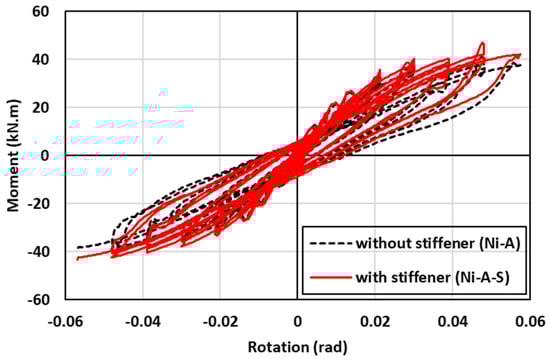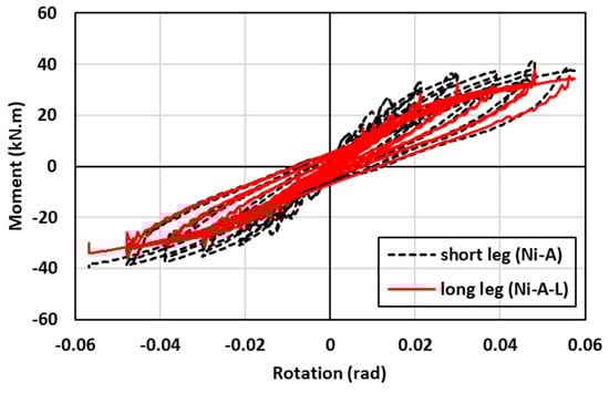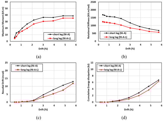 The hysteresis moment-rotation response of the connections with different angle orientations is shown in Figure 24. Two angle orientations (long leg vs. short leg) were considered to determine the effect of the angle orientation on the performance of the connection. The first angle orientation (Ni-A) consisted of two legs in which the short leg of the angle (80 mm) was connected to the column and the long leg of the angle (120 mm) was connected to the beam, as shown in Figure 9c. In contrast, the second angle orientation (Ni-A-L) was fabricated such that the long leg of the angle (120 mm) was connected to the column and the short leg of the angle (80 mm) was connected to the beam, as shown in Figure 17e. In general, the hysteresis moment-rotation response appeared to be improved with the short leg compared to the long leg. Figure 25 shows the results of the moment capacity, rotational stiffness, residual drift, and cumulative energy dissipation for both cases. The initial rotational stiffness, moment capacity, and cumulative energy dissipation of (Ni-A) specimen were 26%, 8%, and 6% higher than (N-A-L) specimen, respectively. Nevertheless, the (N-A-L) specimen slightly performed better than the (Ni-A) specimen. It can be observed that the variations of residual drift between the long and short legs did not exceed 6% and the discrepancies between the two curves were minor. Generally, the advantages of connecting the short leg to the column outperformed the connection of long leg to the same column.