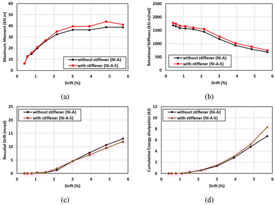 Effect of SMA angle stiffener on (a) maximum moment (b) rotational stiffness (c) residual drift and (d) energy dissipation.