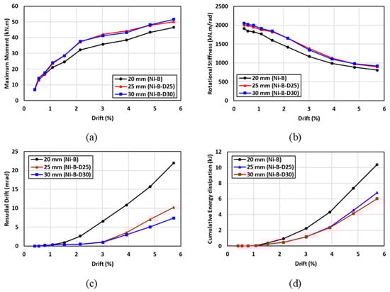 The hysteresis moment-rotation response of the connections with different bolt diameters is shown in Figure 26. Three bolts diameters of 20 mm, 25 mm, and 30 mm were considered to determine the influence of the bolt diameter on the performance of the connection. In general, the hysteresis moment-rotation response appeared to be improved with increasing the bolt diameter. Figure 27 shows the results of the moment capacity, rotational stiffness, residual drift, and cumulative energy dissipation for three bolt diameters. These results indicated that increasing the bolt diameter from 20 mm to 25 mm, improved the moment capacity and rotational stiffness by 11% and 7%, respectively, whereas similar behavior was observed for the connections with 25-mm and 30-mm bolt diameters. Nevertheless, the connections with 20-mm and 25-mm bolt diameters showed insignificant variations in the residual drifts and cumulative energy dissipation, whereas the 20-mm bolt diameter resulted in considerable residual drift and cumulative energy dissipation by 40% and 42%, respectively compared to the other diameters. It can be concluded that there is an optimum bolt diameter to achieve the best performance, which was 25 mm in this case, beyond which insignificant improvement can be attained.