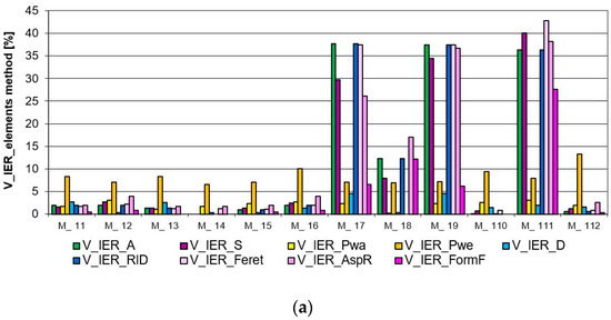 The methodology for calculating the IER inhomogeneity () of the fabric structure was determined using two methods: “elements” and “averages”. In the first method, individual modules from the repeats were sorted, and from them, the average variability of a given parameter was determined as {VIER(1d),…, VIER (4)}: