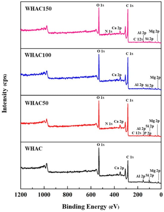 XPS survey spectra of WHAC, WHAC50, WHAC100, and WHAC150.