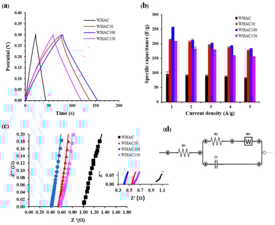 (a) Galvanostatic charge–discharge curve of WHAC, WHAC50, WHAC100, and WHAC150. (b) The specific capacitance at a different current density 1–5 A g−1. (c) Nyquist plots of WHAC, WHAC50, WHAC100, and WHAC150 electrodes at 10 mV within a frequency range of 10 kHz–1 Hz. (d) Equivalent circuit obtained from curve fitting.