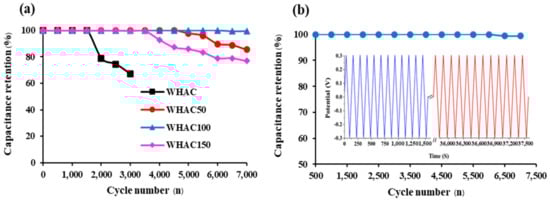 The stability of the WHAC, WHAC50, WHAC100, and WHAC150 electrodes was investigated. In Figure 8a, the specific capacitance (Cp) in the first 1500 cycles was 100% of capacitance retention in all samples. After 3000 cycles, the Cp of WHAC electrode dropped significantly to 67.03%, whereas the Cp of WHAC50, WHAC100, and WHAC150 changed slightly. After 7000 cycles, the Cp dropped to 85.39%, 99.45%, and 76.87%, respectively. This result suggests that WHAC100 showed better cycle stabilities than other samples, which remained at 100% retention over 6500 cycles, then slightly decreased to 99.40%, and stayed consistent at this value beyond 7000 cycles, as shown in Figure 8b.