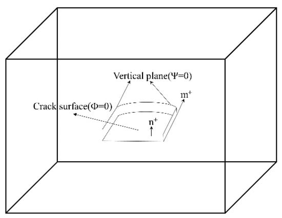 There is a jump function when crossing the crack surface, which is a discontinuous step function crossing the crack surface. Formula (1) shows a sampling (Gaussian) point that represents the function of the point closest to the crack and the unit perpendicular to the crack vector. F(x) is a function showing the progressive crack tip in an isotropic elastic material. We used the crack tip function for isotropic elastic materials to account for the normal and tangential coordinates of the crack.