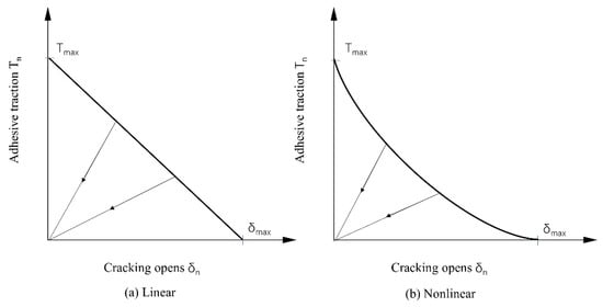 The crack geometry is defined using two coincidence distance functions, as shown in Figure 2. The two intersecting surfaces define the crack front, and each node describes the specific crack geometry through these two signed distance functions. The failure mechanism of the crack unit in Abaqus includes two parts, one is the damage initial criterion and the other is the damage evolution law. After a damage initial criterion is met, the calculation can continue based on the defined damage evolution law. Figure 3 shows a typical linear and nonlinear traction-separation response.